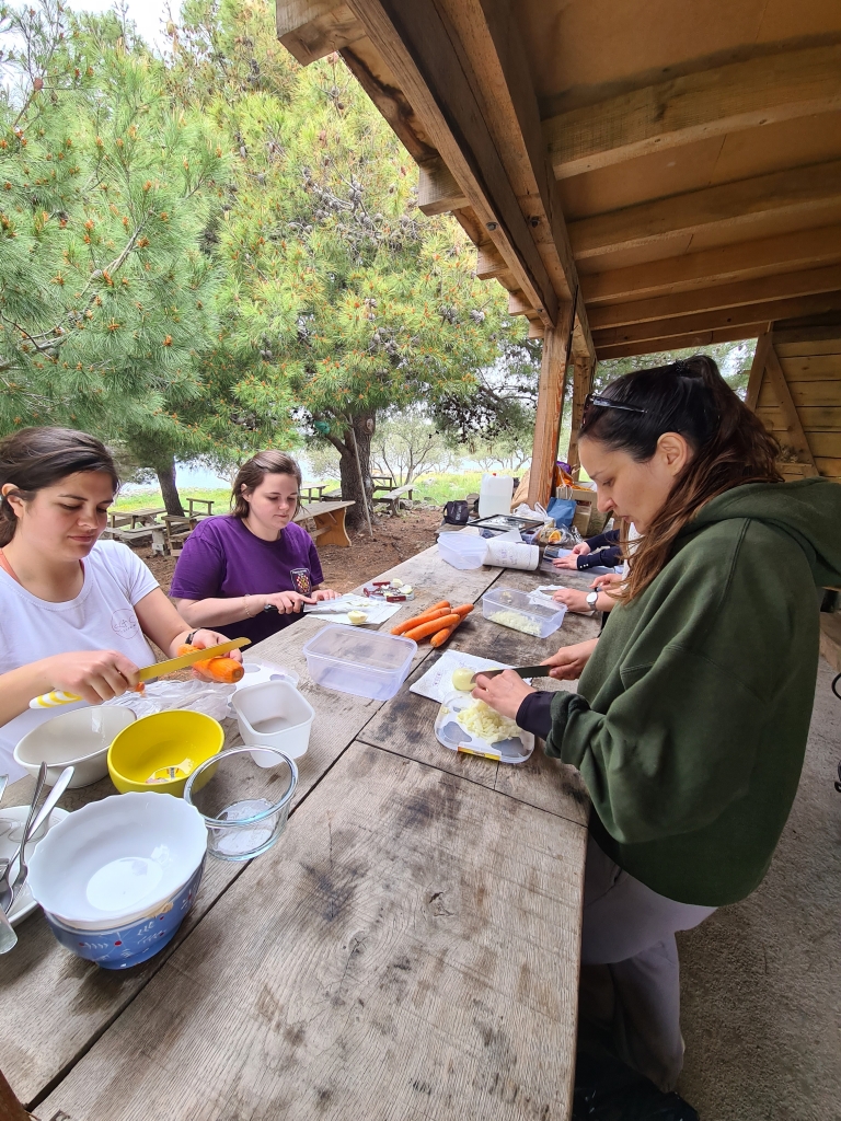 Nakon mise, zaputili smo se na Modrave i podijelili zadatke koje smo trebali obaviti. Uslijedila je rezidba maslina, popravljanje stolova i klupa u kuhinji te pripremanje ručka. Moj zadatak bilo je kuhanje, ali koristila sam svaki slobodan trenutak da se iskradem iz kuhinje i što više guštam u moru, vjetru, valovima, odbljesku sunca, pogledu na brata čovjeka pokraj sebe…