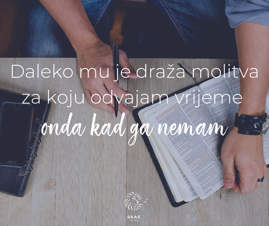 Od 24 sata u danu izdvojim tek nekoliko desetaka minuta za Boga. Dok fakultetske obveze u lipnju oko mene stežu svoj obruč, sve manje i manje vremena provodim s Bogom jer imam osjećaj da tako gubim vrijeme koje mi je sada toliko dragocjeno. Iako je Bogu milo, koliko god Mu se kratko obratio, pa i ona molitva koju molim jer mi je preostalo nešto vremena u danu, daleko mu je draža molitva za koju odvajam vrijeme onda kad ga nemam. Time otkidam od nečeg meni bitnog kako bih dao Bogu, onome najbitnijemu. „Svi su oni zapravo ubacili od svoga suviška, a ona je od svoje sirotinje ubacila sve što je imala, sav svoj žitak“, rekao je Isus svojim učenicima. Poput bogataša koji daju suvišak svojeg novca riznici, ja odvajam vrijeme za Boga. Pomozi mi, Bože, da i ja ustrajem u molitvi i u Tvojoj prisutnosti onda kad mi se čini da mi to obveze ne dopuštaju!
