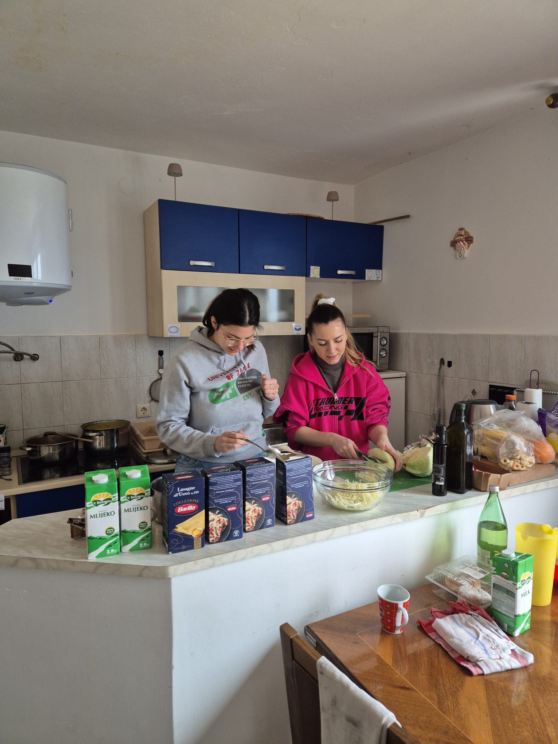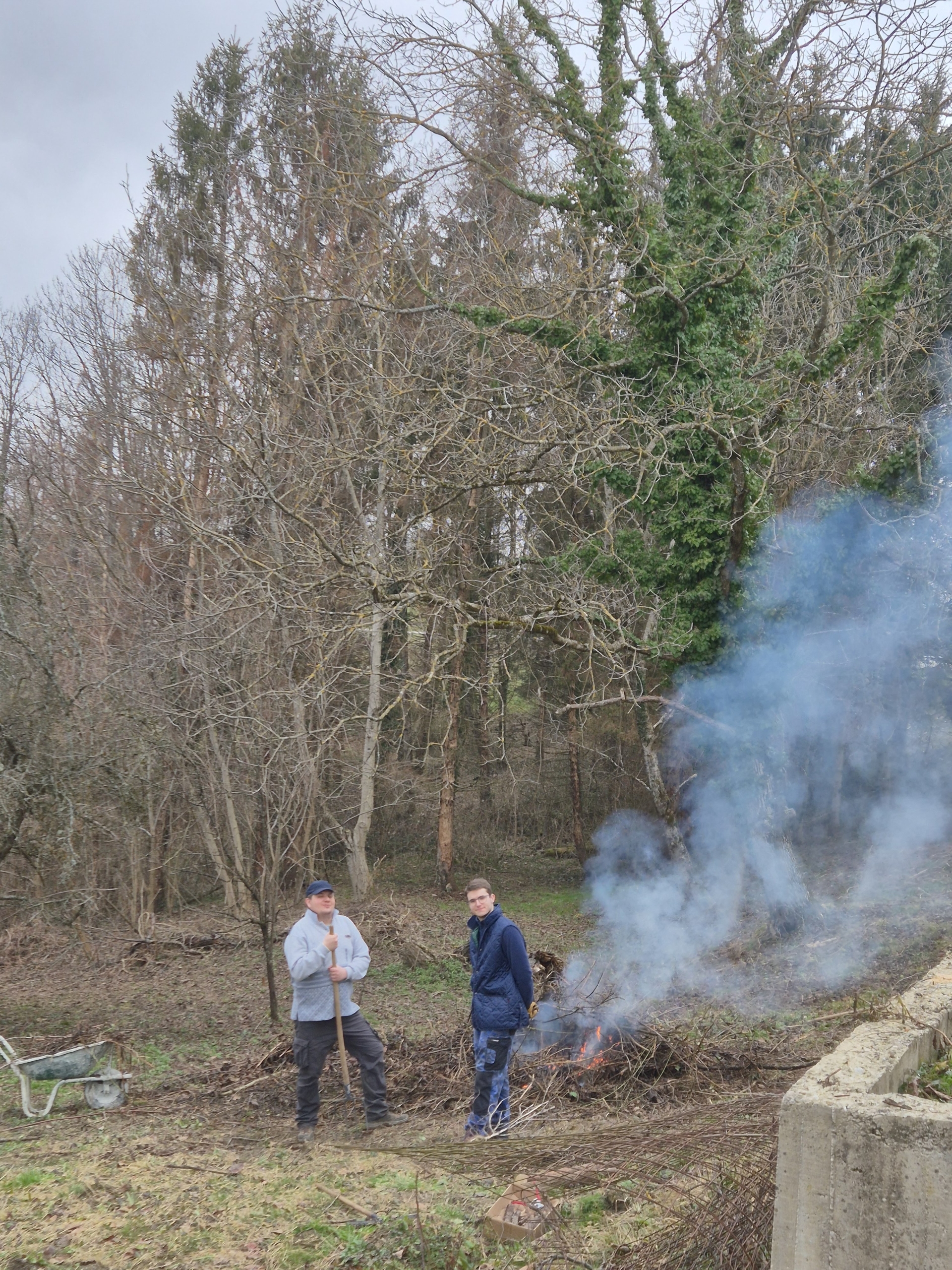 Potom su se volonteri raspodjelili u četri skupine i krenula raditi. Prva ekipa dečkiju bacila se na paljenje granja nakupljenog u prethodnim rasčišćavanjima šume. Drugu ekipu činile su cure koje su praznile i čistile ormar u koji je ušla vlaga, vakumirale poplune i jastuke, te dečki koji su rastavili dva krevete. Priprema je to za iduću radnu akciju u kojoj ćemo sanirati vlagu i plijesan koja je niknula tijekom obnove krovišta u prizemlju kuće. Treća ekipa, vrijedne kuharice, spremale su ručak koji je oduševio sve volontere (lazanje 😋). Četvrta ekipa dovršavala je radove na struji u podrumu koji su preostali od ljeta.