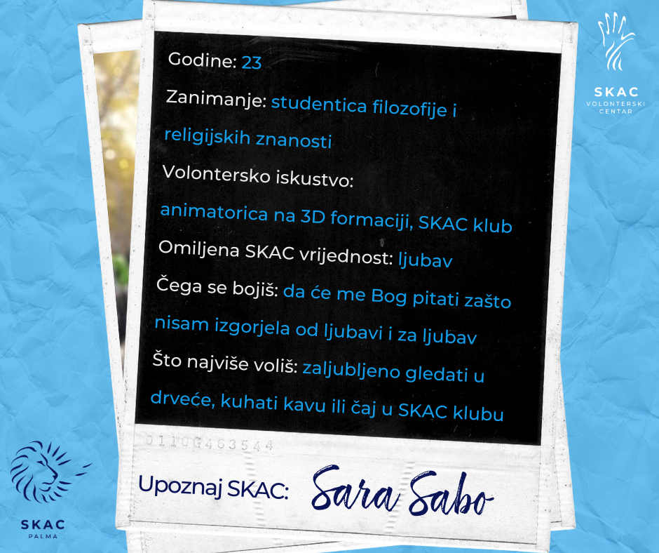 Sara je kao dijete bila razigrana, živa i vesela. Kad je došla u SKAC, uhvatila se posla. Krenula je na 3D formaciju, volontirati u klubu, pjevati sa zborom za Boga. A onda je klub ostao bez voditelja. Sara je nekako i hrabro i ponizno, i nepromišljeno i odmišljeno ponudila sebe na to mjesto. I što je u tome tako herojsko? Uslijed svih svojih želja i mogućnosti, dala se negdje gdje je malo po malo (pod)nosila teret, radila ono što se ne vidi, skrbila o onom i onima za koje nismo znali. Odštopavala WC, i ne dramatizirala pred tim činom. Podnosila je teret, a odšutjela njegovu težinu. U vođenju kluba je bila predana svakom zadatku, želeći ga napraviti najbolje moguće, vjerujući da je to ono što je Bogu milo.