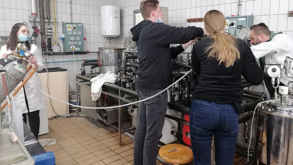 I sve je nekako teklo… Sve do dan prije samog eksperimenta. Tijekom završnih priprema opreme za kuhanje piva, pukla je pumpa. Nismo imali izbora nego odgoditi eksperiment. Bila sam baš tužna i ujedno se pribojavala koliko će uopće trebati vremena da se to popravi. Mario, naš tehničar Igor i ja pretakali smo desetke litara ulja iz pumpe u kanistre i ponovno u sustav, ne znam ni sama koliko puta, te stalno smišljali nove ideje kada nije bilo dobro. Iako je s vremenom rasla obeshrabrenost i iznerviranost oko zastarjele opreme, ne mogu zaboraviti kako se Mario trudio ne naživcirati i naposljetku – ne odustati. Samo da bih ja mogla skuhati pivo! Rekao je u jednom trenu – ne brini se, kuhat ćemo mi to pivo, ne znam kako, ali hoćemo!